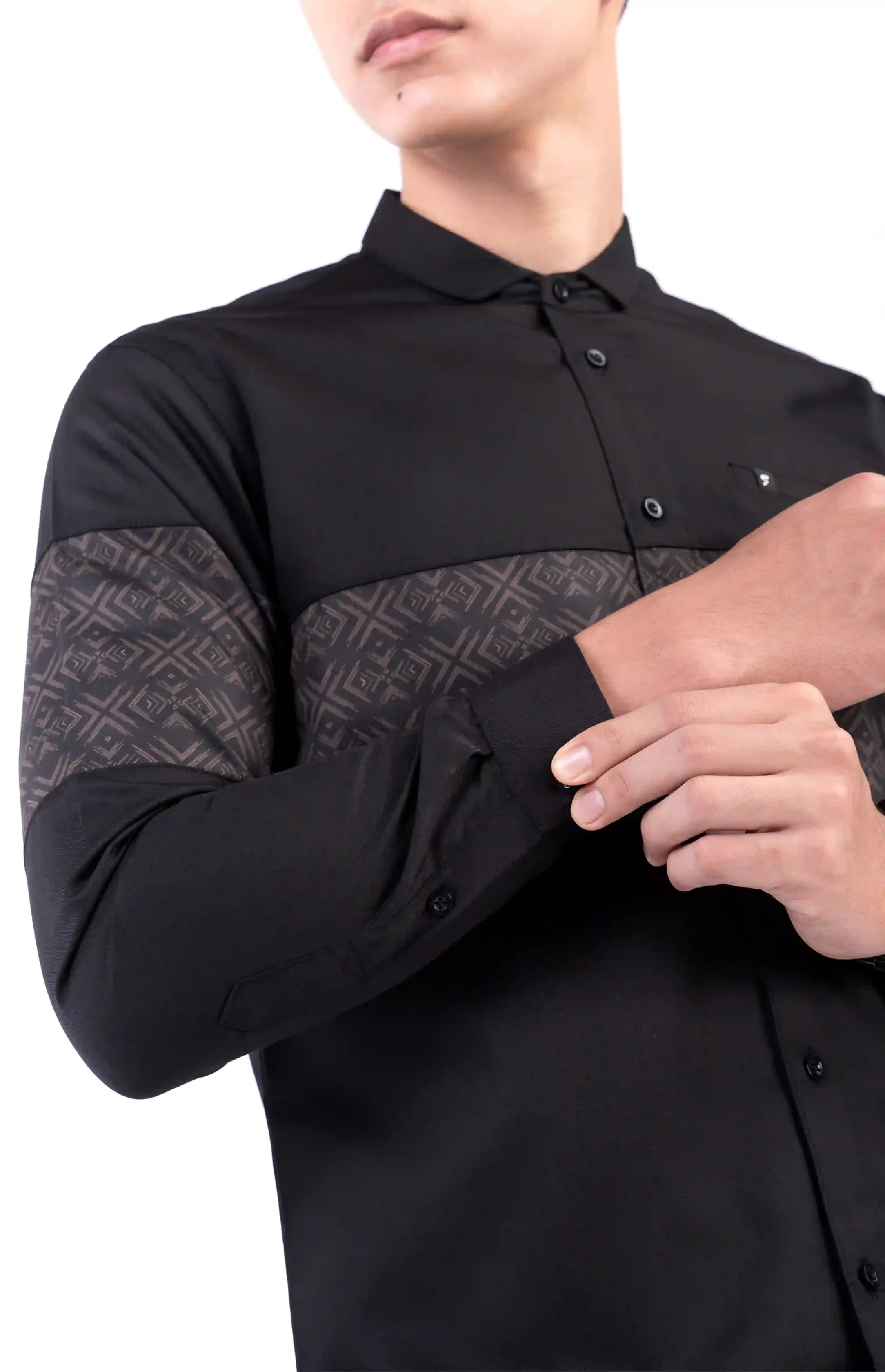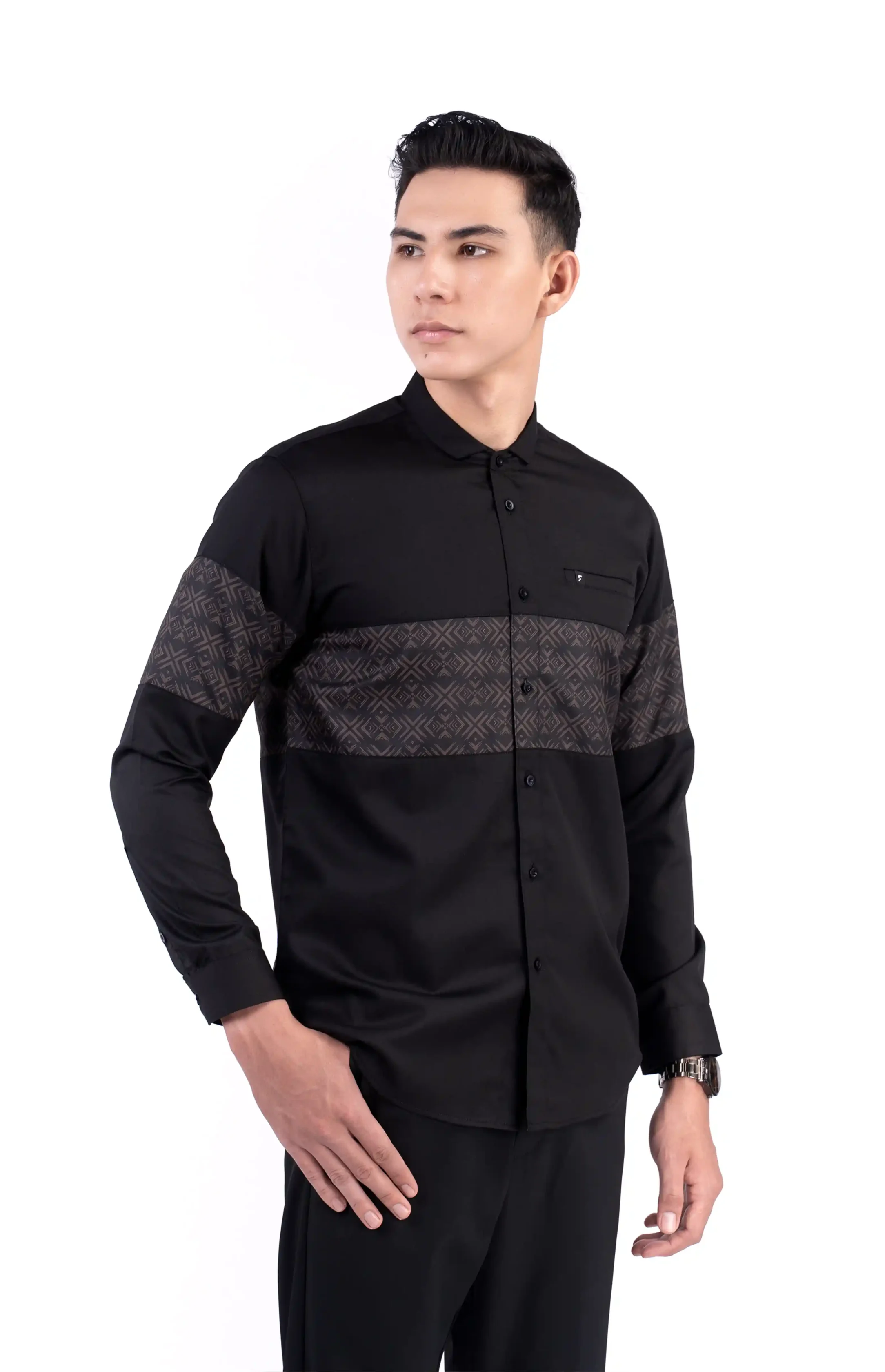 Koko Modern Elegan dengan perpaduan motif greometric modern etnic Nusantara, dengan cutting horizontal exclusive dipadukan dengan kombinasi warna black dan caramel pada motif. Menjadikan penampilan lebih ekslusif, modern, dan elegan.