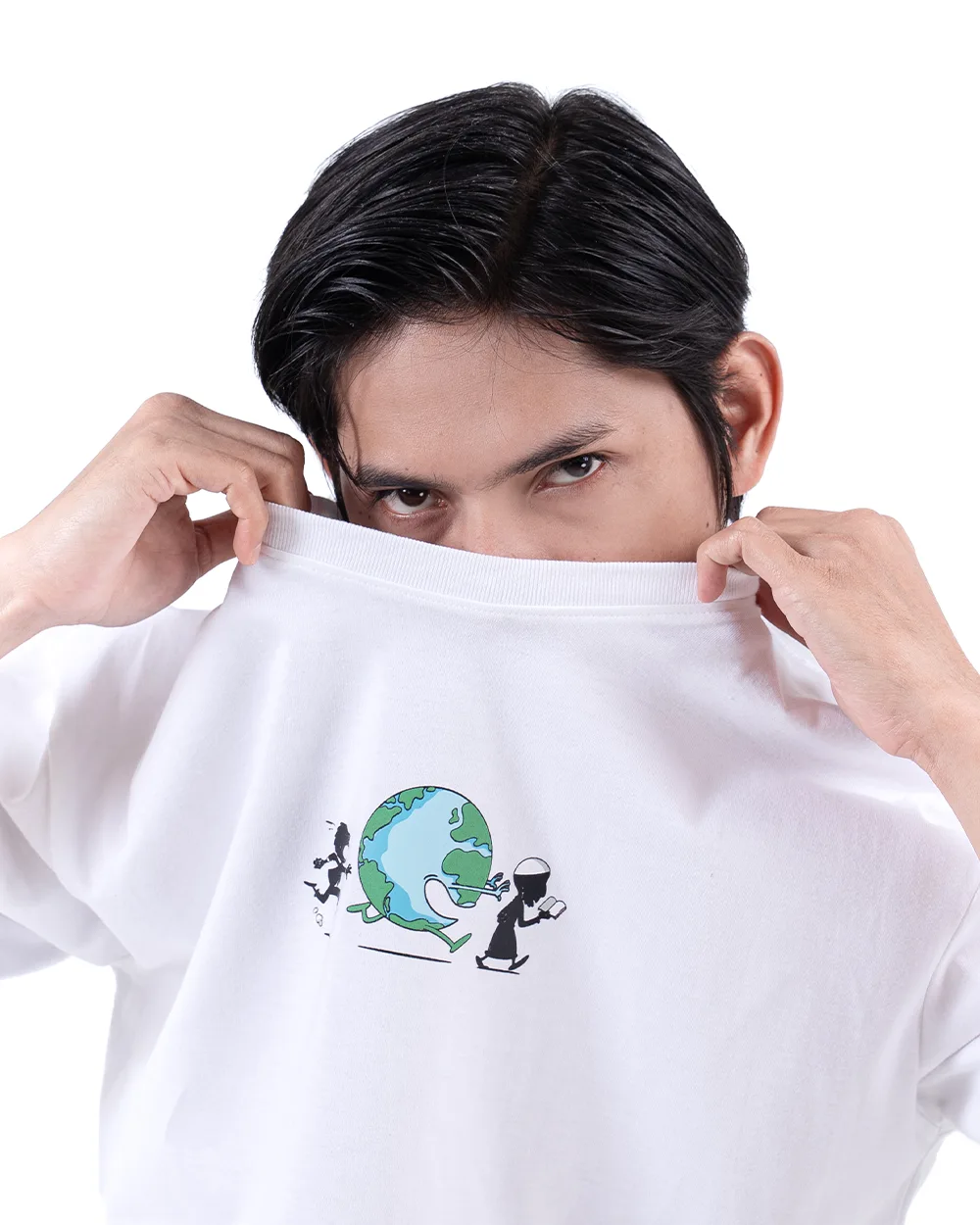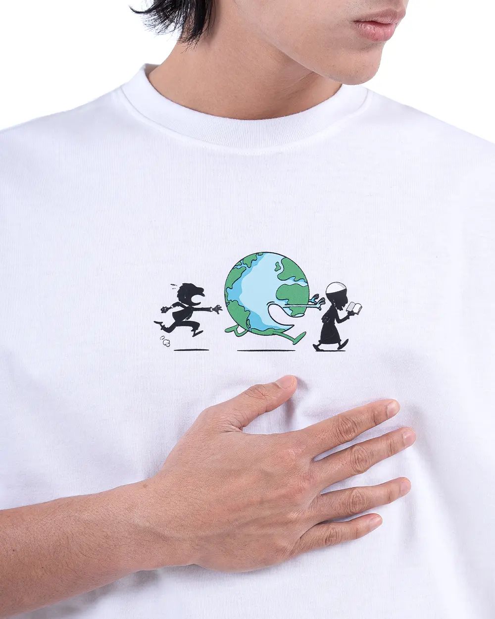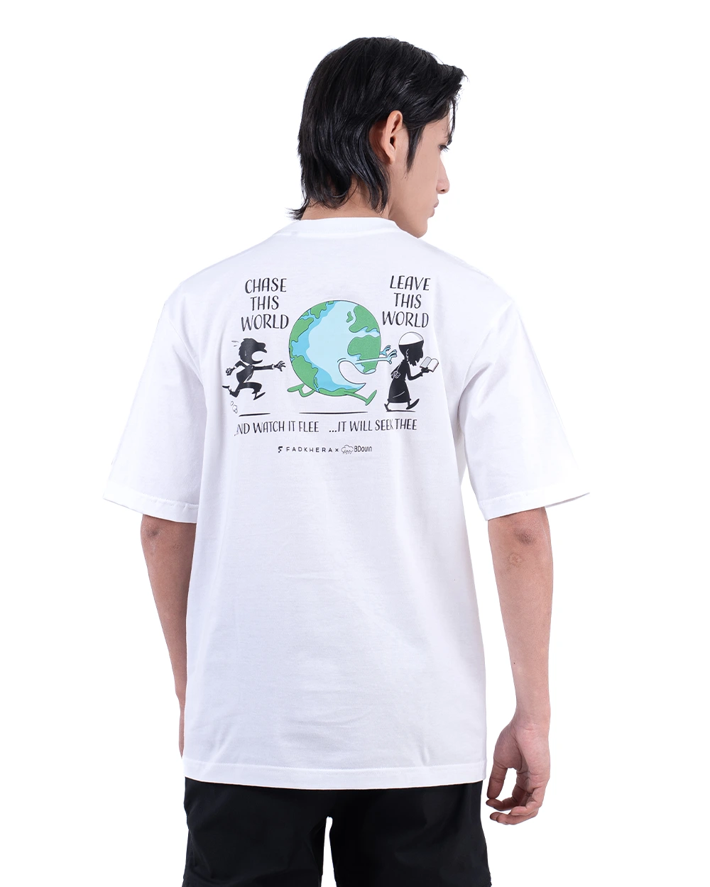 Series Oversized T-Shirt eksklusif dengan ilustrasi manusia yang berlari mengejar dunia, namun lupa arah tujuan sejati. Artwork visualnya menghadirkan narasi satir yang mengingatkan akan hakikat hidup bahwa orientasi sejati seorang muslim bukanlah dunia fana, tapi akhirat yang abadi.