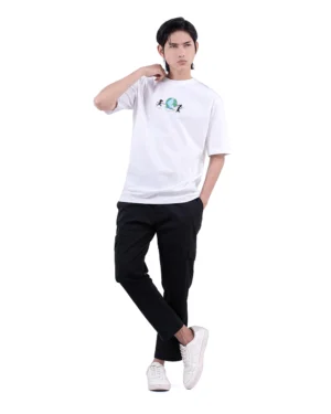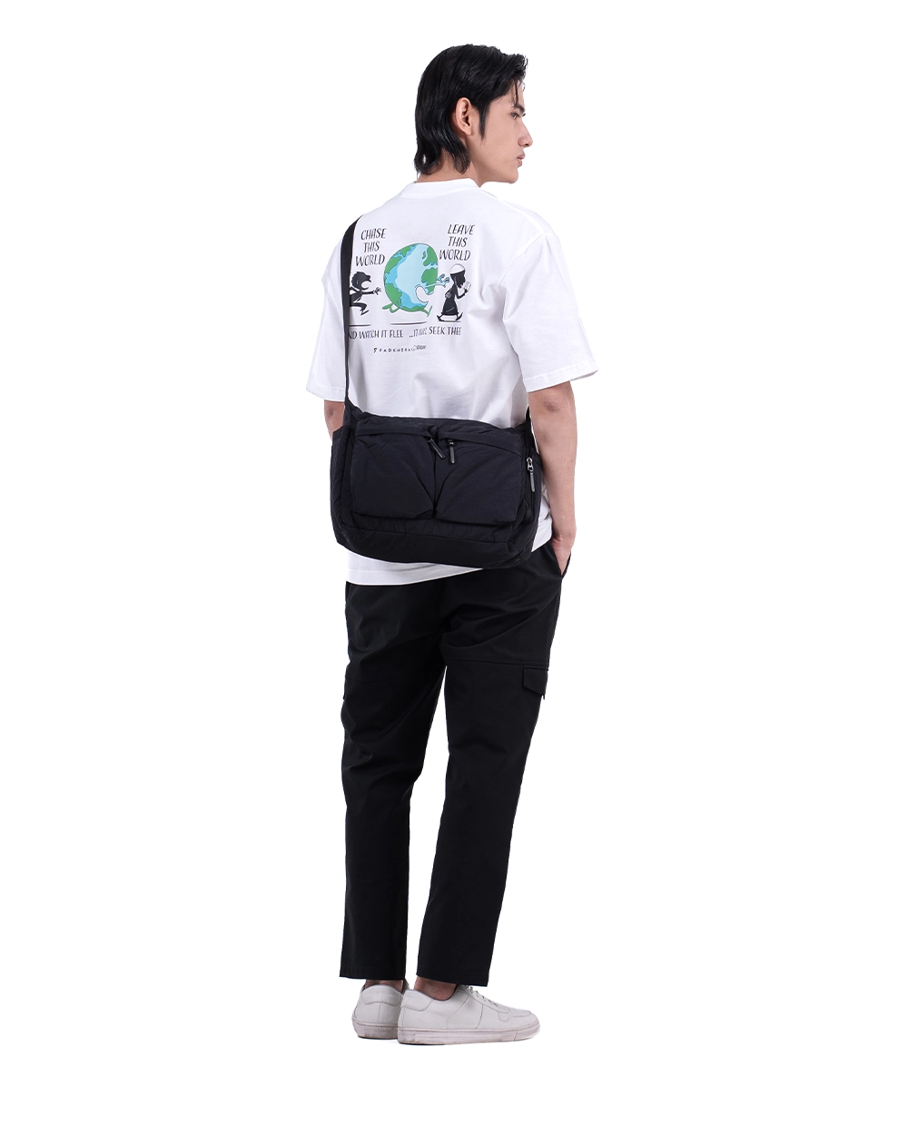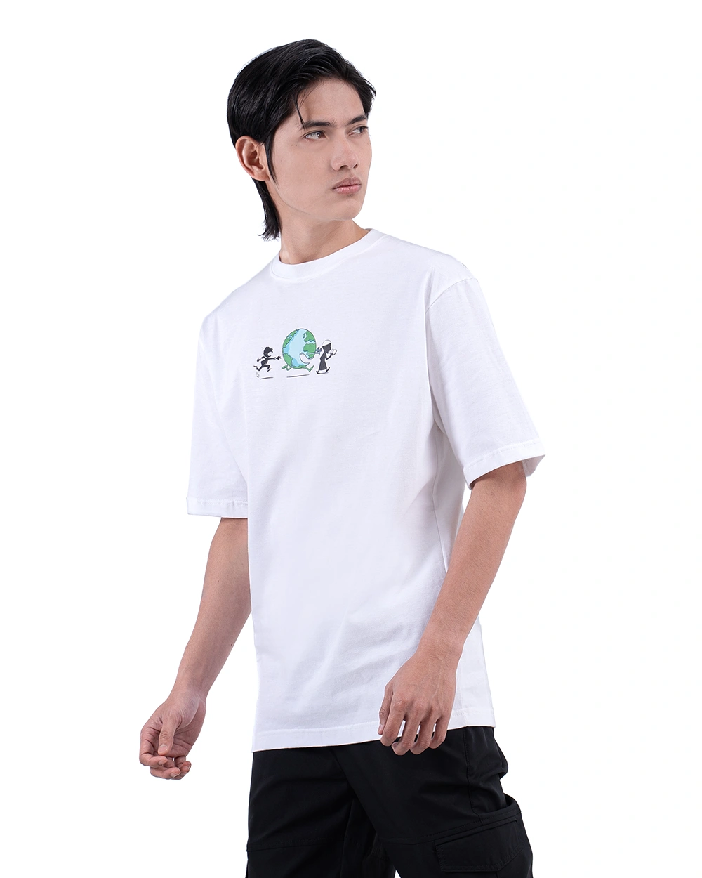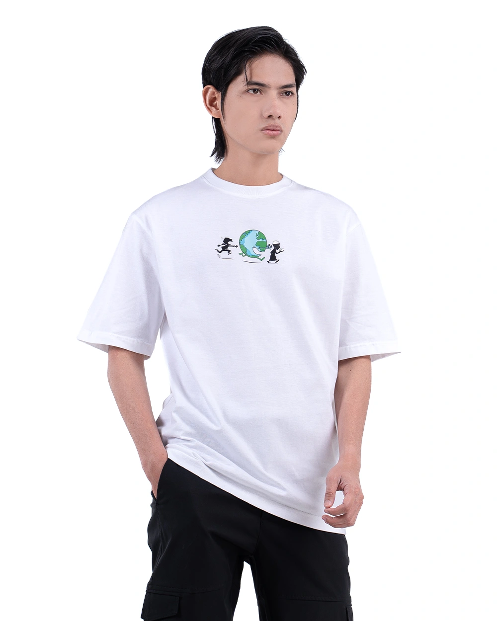 Series Oversized T-Shirt eksklusif dengan ilustrasi manusia yang berlari mengejar dunia, namun lupa arah tujuan sejati. Artwork visualnya menghadirkan narasi satir yang mengingatkan akan hakikat hidup bahwa orientasi sejati seorang muslim bukanlah dunia fana, tapi akhirat yang abadi.