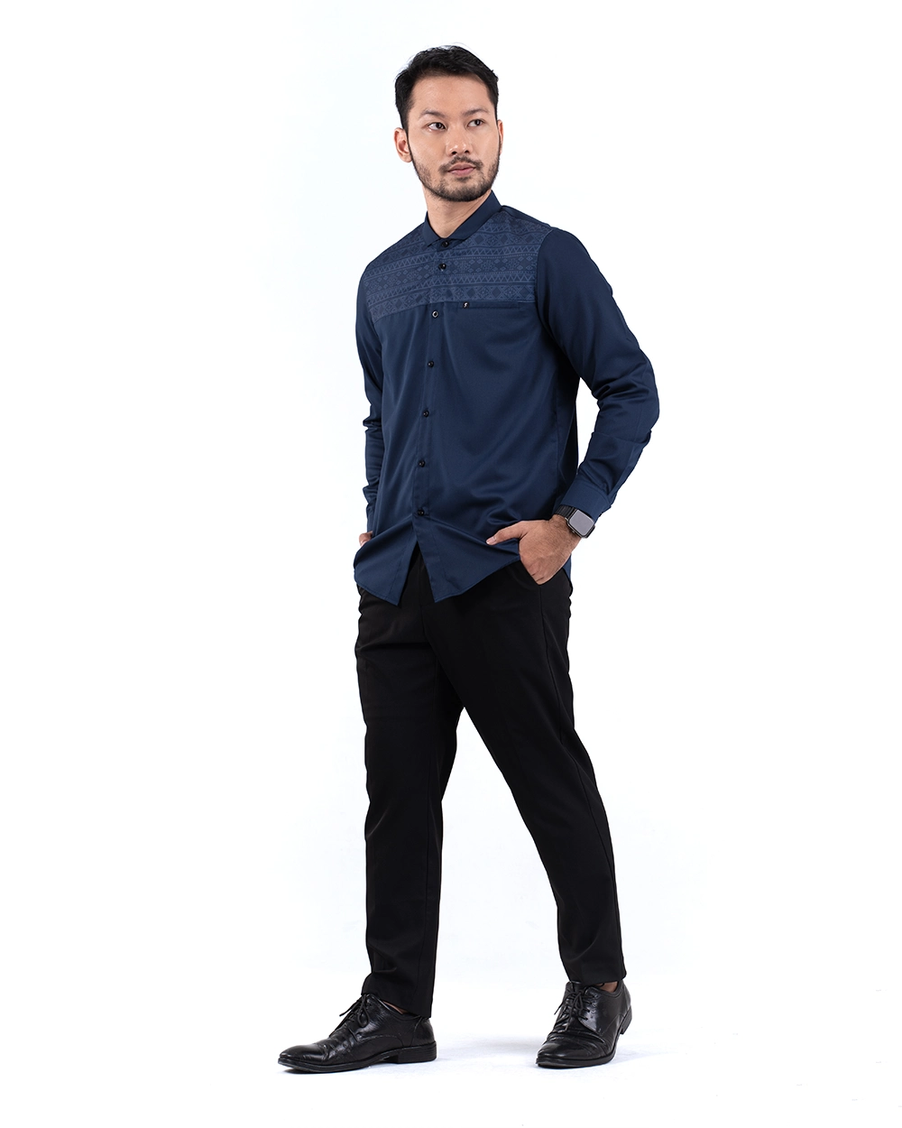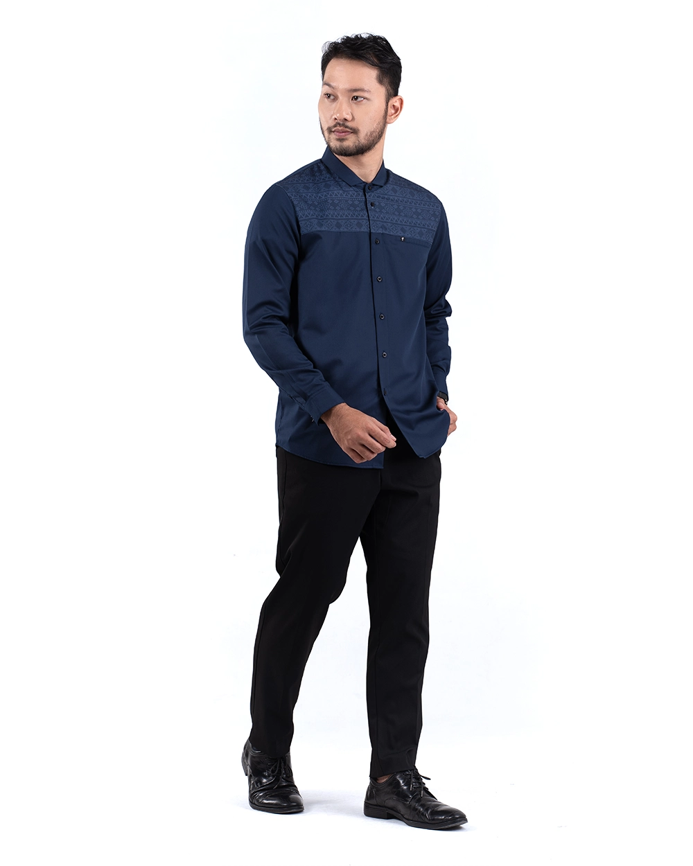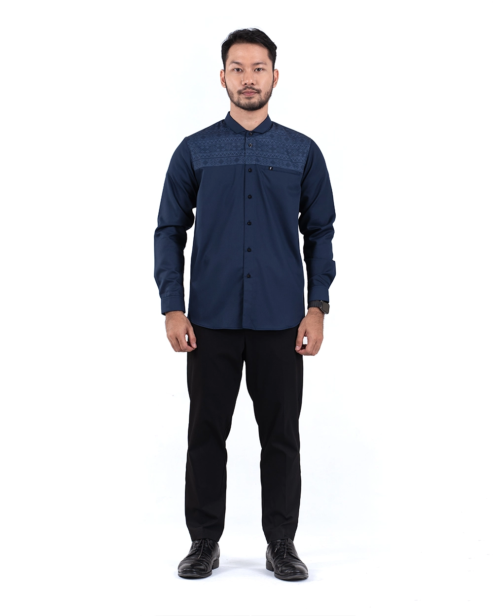 Koko Modern Eksklusif dengan perpaduan motif Modern Geometric Diamond berwarna Navy combination dibagian atas. Dipadukan dengan kombinasi warna solid navy dibagian bawah membuat penampilan fashion yang selalu tampak stylish dan cool.