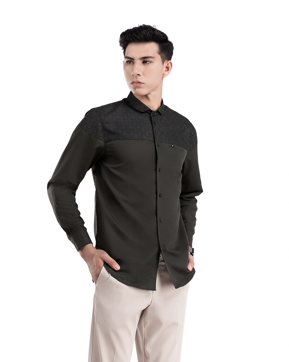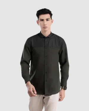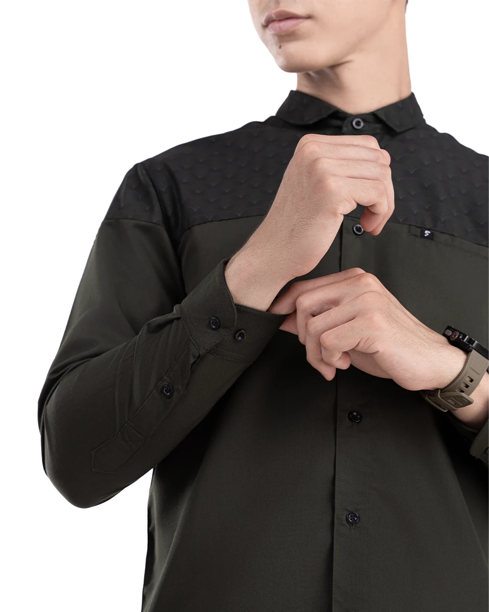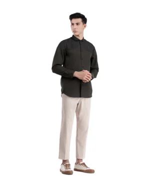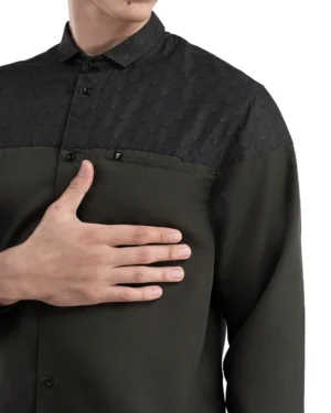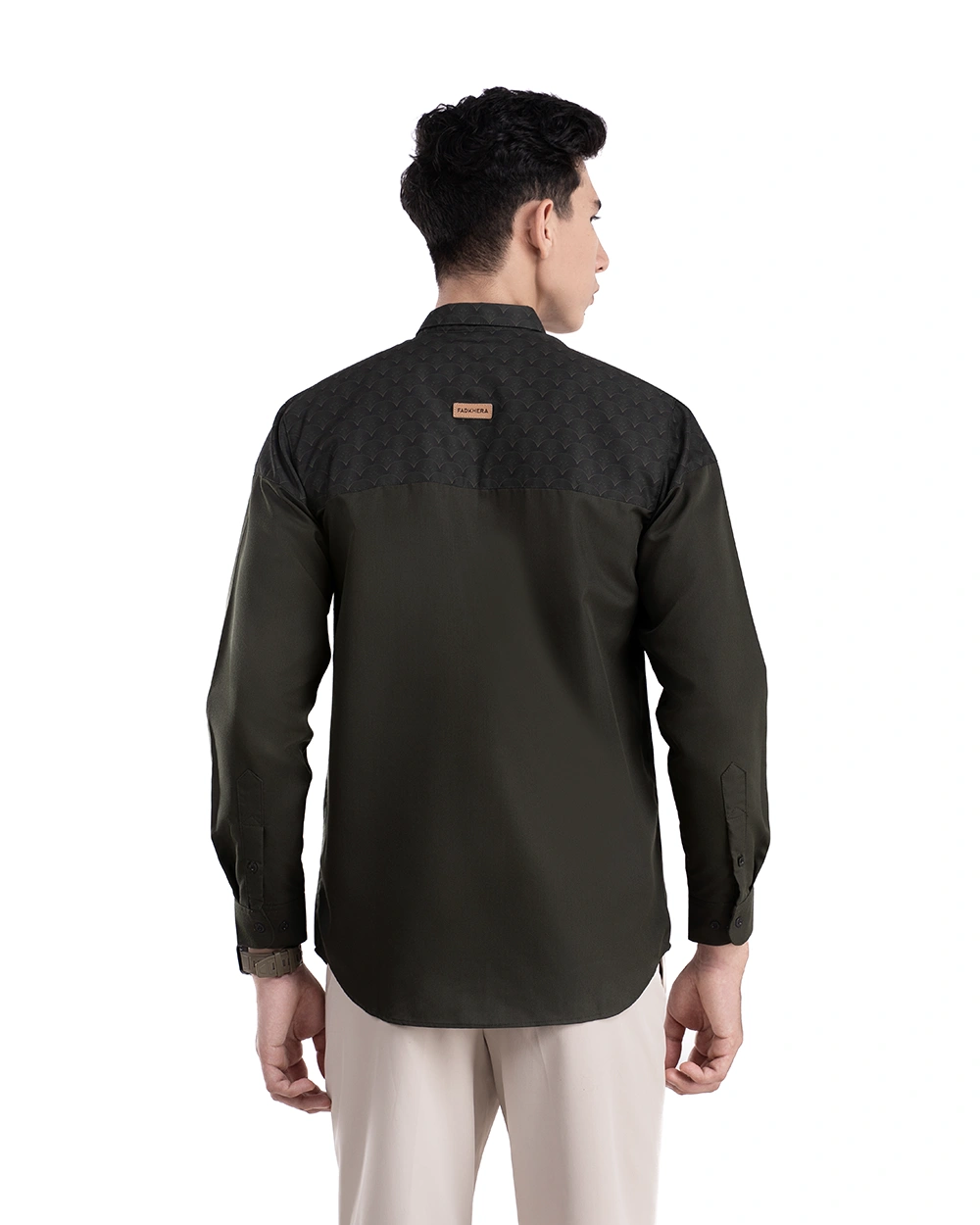 Susunan motif yang berulang mencerminkan konsistensi dalam menjaga prinsip hidup. Seperti shaf yang tersusun rapi dalam salat, setiap elemen memiliki posisi dan peran yang saling melengkapi. Tidak ada yang berdiri sendiri, semuanya terhubung dalam harmoni yang kuat. Balutan warna dark olive memperkuat kesan dewasa, stabil, dan membumi, menjadikan Raslan pilihan tepat untuk pria Muslim yang ingin tampil rapi, berkarakter, dan penuh makna.